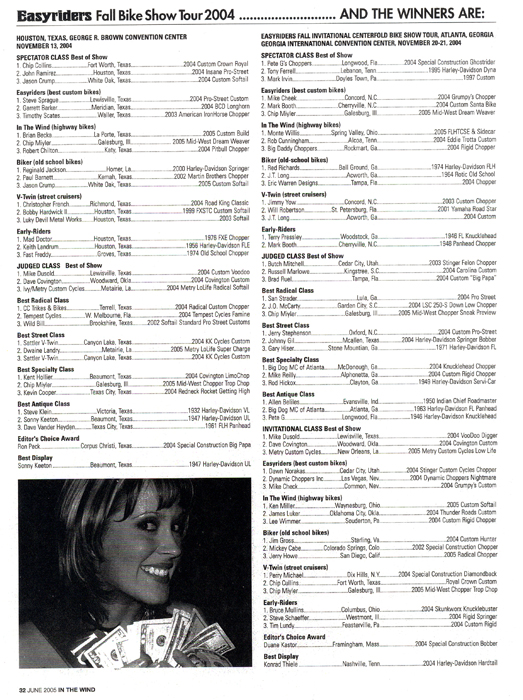 The Easyriders Bike Show Tour for 2004 kicked some serious ass! The Centerfold Tour featured many master hike builders that you may have seen on The Discovery Channel's The Great Biker Build-Off series. When you attended an Easyriders Bike Show last year, you had the chance to hobnob with the likes of Indian Larry, Billy Lane, Paul Yaffe, Kendall Johnson, Eddie Trotta, Rick Fairless and Kirn Suter...[ read more ]