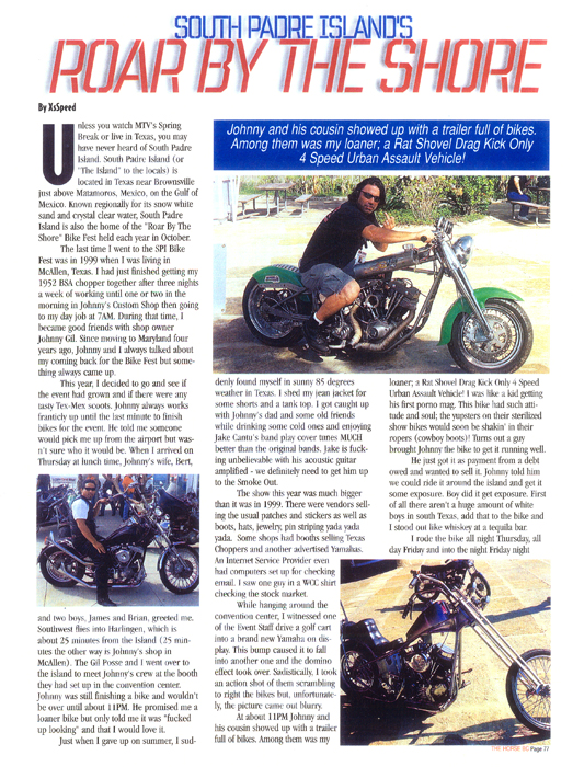 When most people think of Texas , they think of The Dallas Cowboys, Lance Armstrong or maybe Lone Star Beer but, when I think of Texas , I think of Johnny's Custom Shop. Johnny's Custom shop is located in McAllen , TX , 65 miles west of South Padre Island on the Rio Grande River . Johnny's is an old school Harley Shop specializing in all years and models of HDD's from Flatties to Evos...[ read more ]